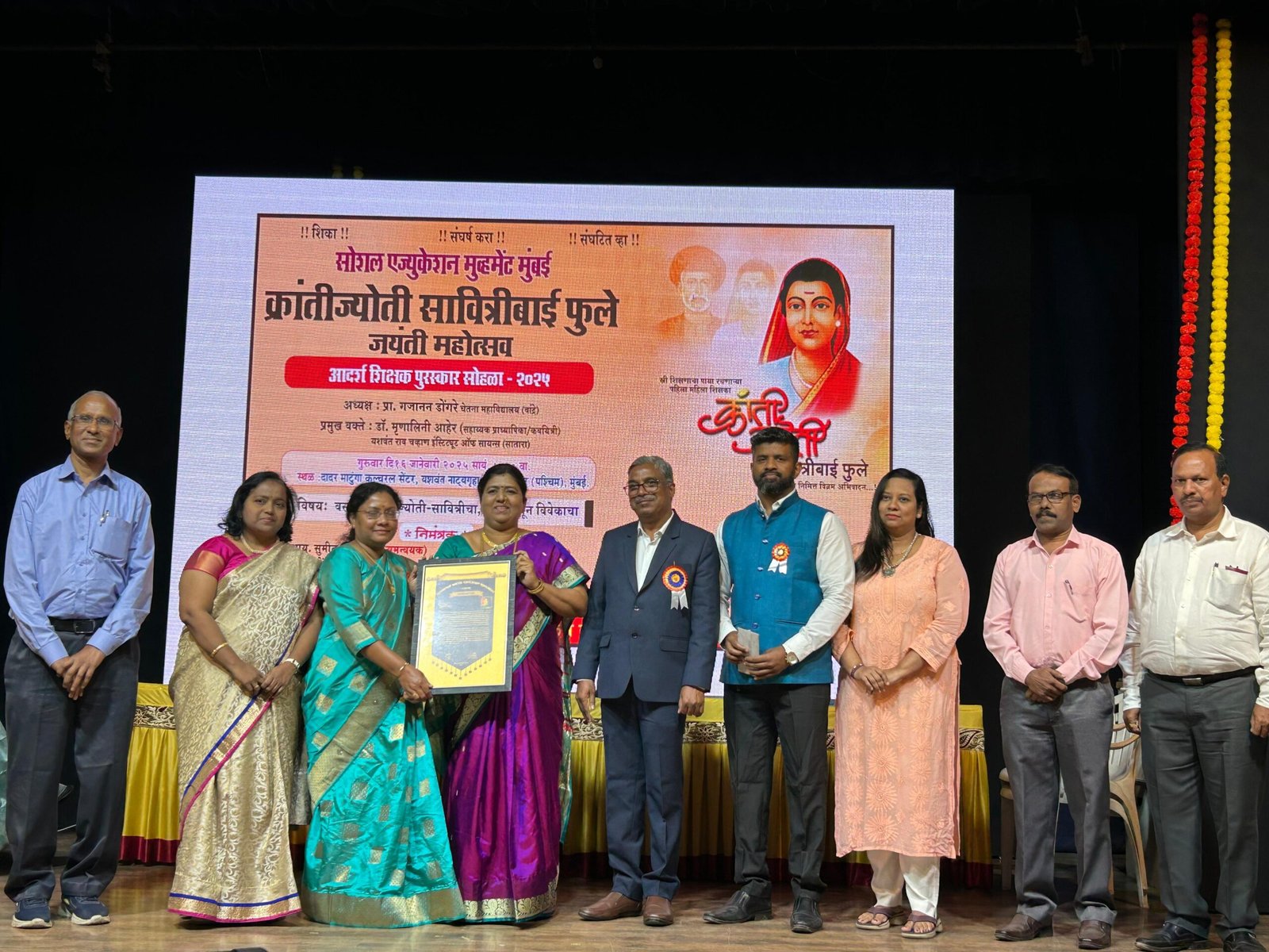कल्याण – छत्रपती शिक्षण मंडळाच्या नूतन विद्यालय,कल्याण या शाळेतील ज्येष्ठ शिक्षिका शुभांगी आनंद भोसले यांना यंदाच्या सोशल एज्युकेशन मुव्हमेंट, मुंबई या संस्थेचा मानाचा सावित्रीबाई फुले महिला आदर्श शिक्षिका -२०२५ पुरस्काराने सन्मानित करण्यात आले. शिक्षणाचा वसा हाती घेतलेल्या सावित्रीमाईच्या लेकीला त्यांच्या नावाने पुरस्कार देऊन गौरवण्यात आल्याने आजी माजी विद्यार्थी वर्गातून आनंद व्यक्त केला जात आहे.